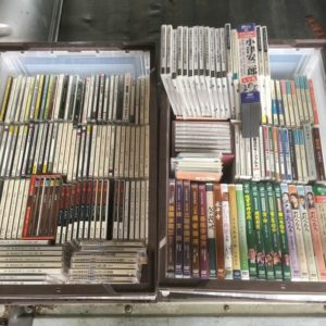 DVDは落語名作選やNHKドラマ・NHKスペシャル、邦画の懐かしいところが多く、CDは日本の愛唱歌や60年代70年代の歌謡曲、クラシック音楽の揃いものが150点ほど。