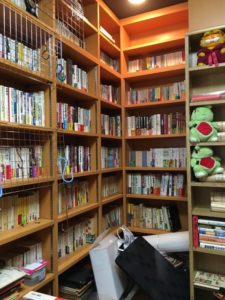 隣の部屋には、やはり壁一面の本棚と、独立タイプの本棚が2棹。漫画・コミックの部屋のようです。どの棚にも奥と手前の2重にきれいに並べられています。この部屋だけで2,000冊はありそうです。