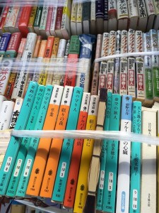 和室の畳の上いっぱいに敷物が敷かれ、背を上にした状態で大量の本が並べられています。ジャンルごとにまとめられており一目でどんな本があるか分かるようにご配慮いただいているのが伝わってきます。